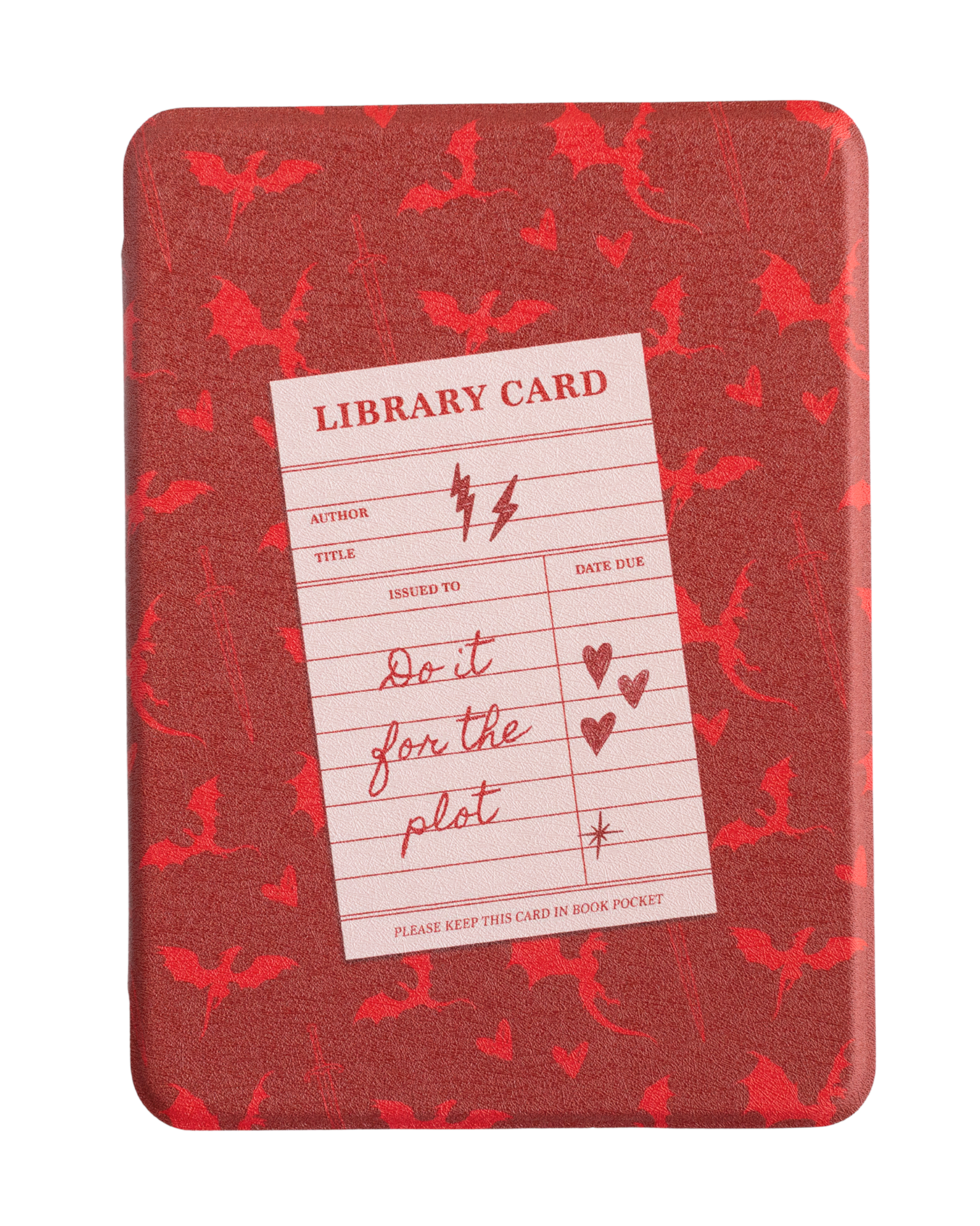 A vintage library card stamped across a dragon-patterned background, casually reminding us to “Do it for the plot.” Perfect for the heroine who reads like she’s training for an adventure she hasn’t been invited to yet.
