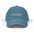 A soft, worn-in denim hat embroidered with elegant script that reads “Well Read.”