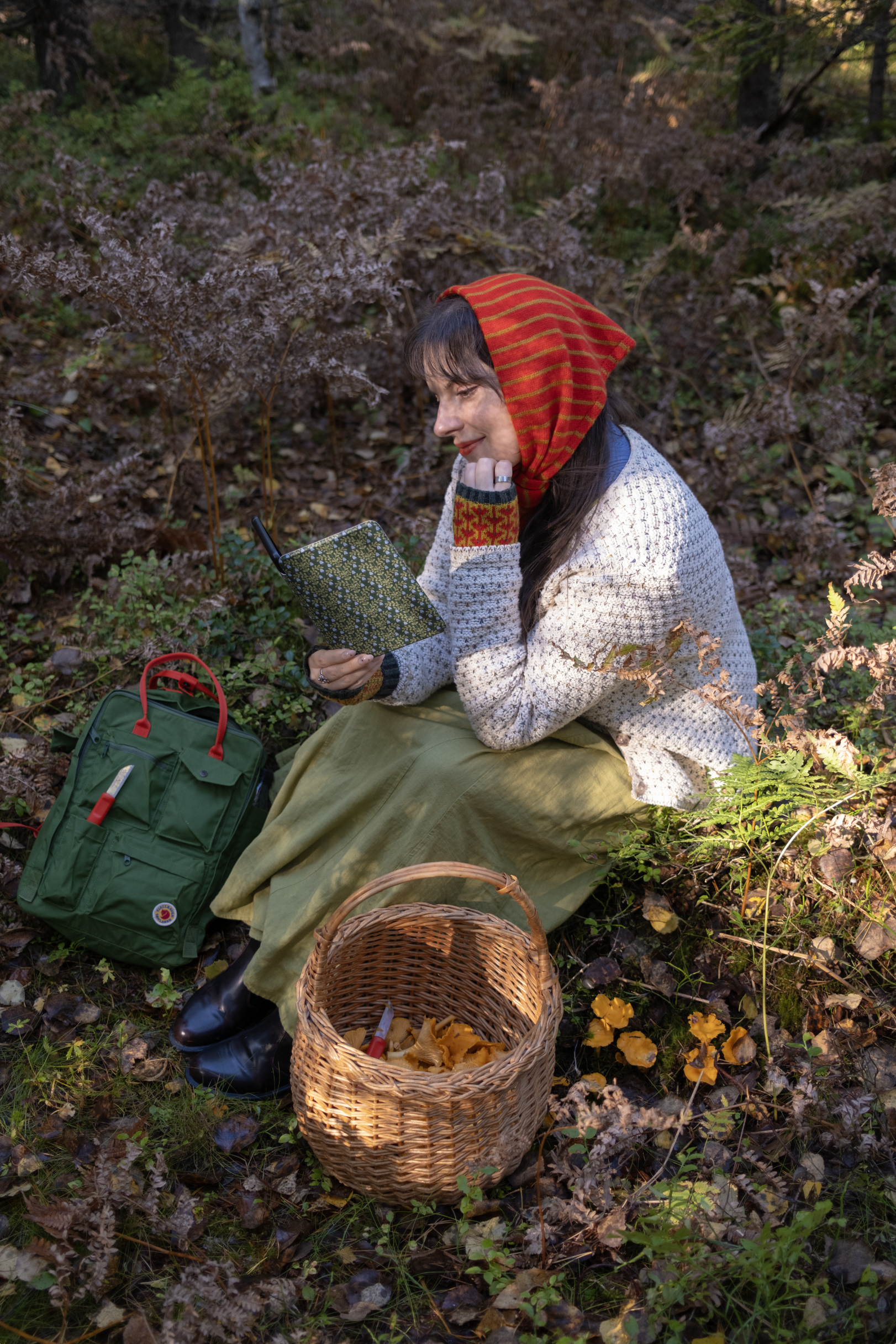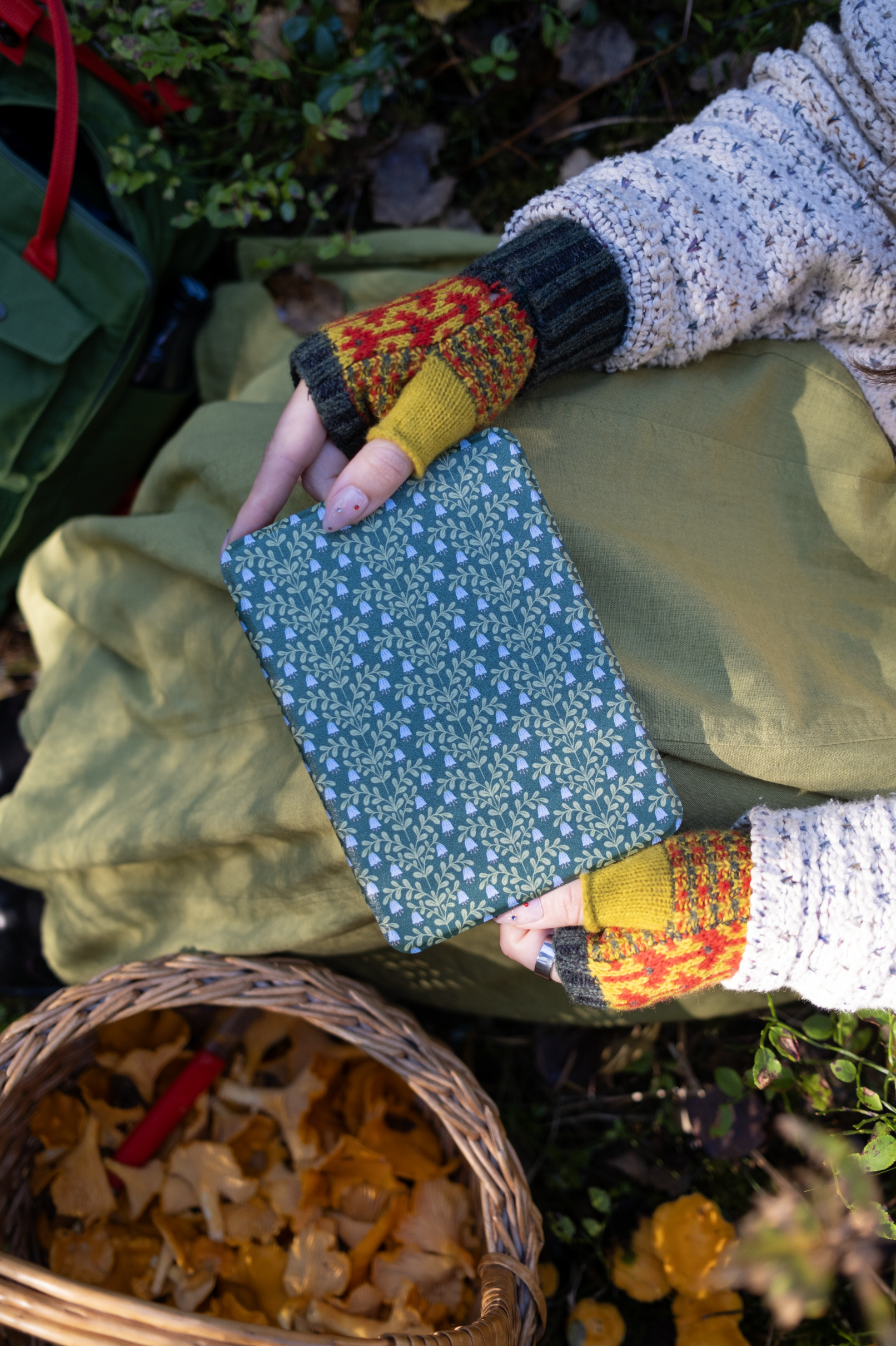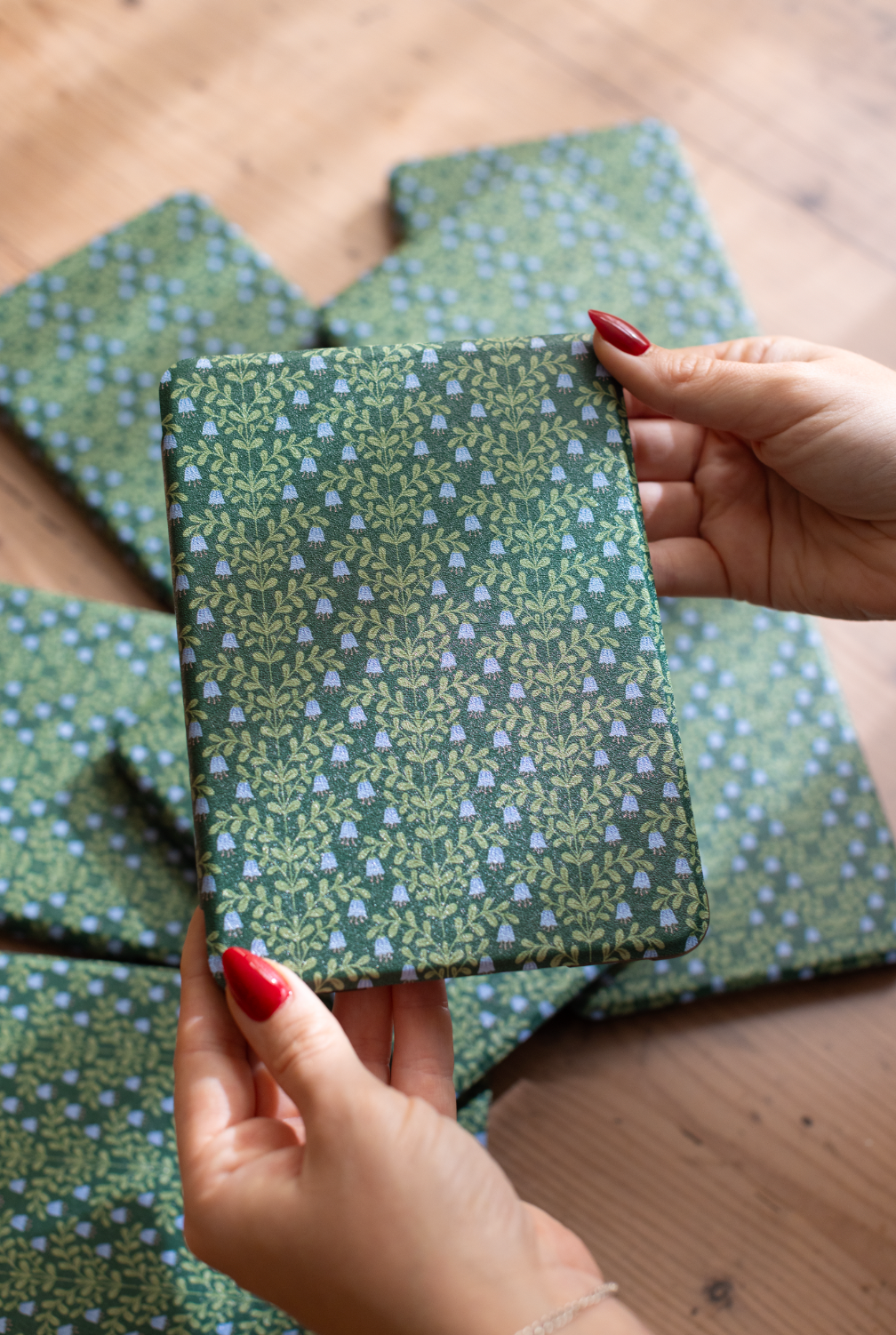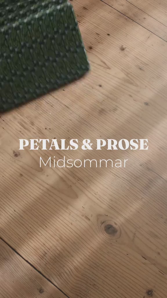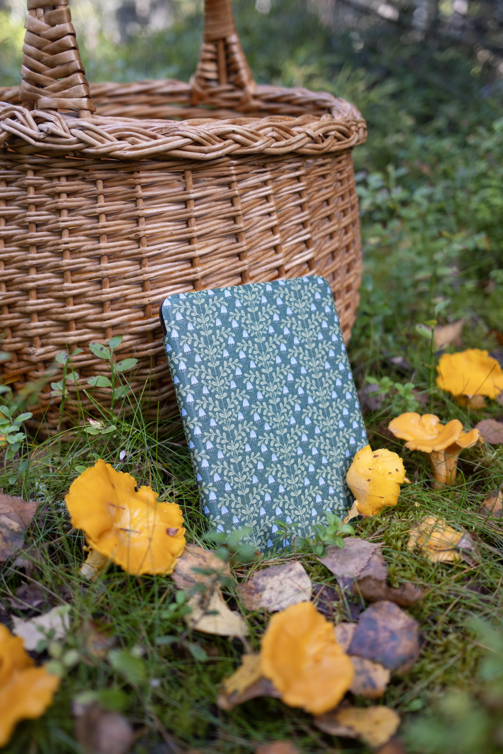 Tall sprigs of leafy green branches climb in neat vertical stripes, dotted with soft blue bellflowers, all set against a deep forest green — a Midsommar-inspired pattern made for evening garden parties, fresh cut flowers, and long chapters outdoors.